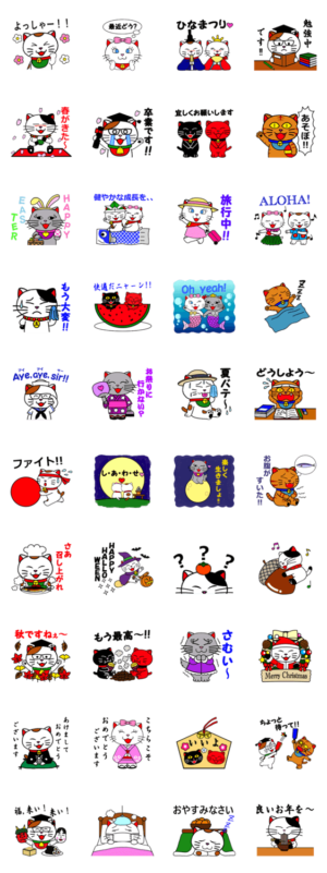 招き猫をモチーフにしたキャラクター、まねきくんとそのなかまたちのスタンプ。今回は、オールシーズンバージョン!