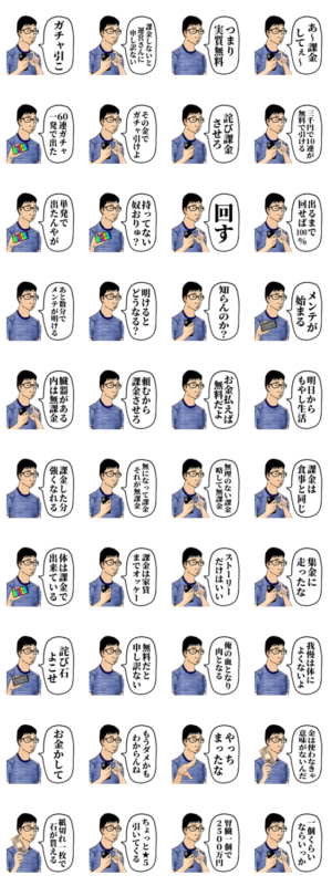 【ネタ/煽り/どや顔/面白い/イケメン/返信/便利/使いやすい/ムカつく/友達/感想/適当/かっこいい/オタク/中二/暇/親切/回りくどい/ゲーム/消費者金融/臓器】