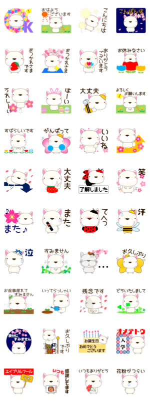 ブルドック、犬好きの方へ。字がはっきりしていて見やすく、使いやすい日常会話を集ました。ありがとう、おつかれさま、了解等。春編で、入学、母の日、エイプリルフール等