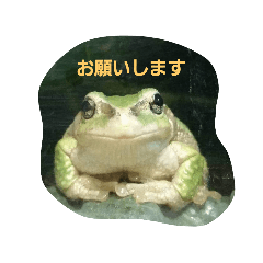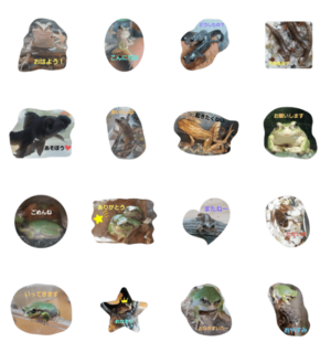 アマガエルのガマちゃんとそのお友達、サンショウウオ、出目金、エゾアカガエルのスタンプです。Char より発売