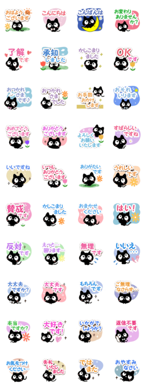 『クロネコすたんぷ』の丁寧な言葉、敬語編です。やさしい色合いの文字に、ていねいな挨拶いっぱいの黒猫スタンプです。くろねこ好きな方にぜひ。【かたこ】かたこ より発売