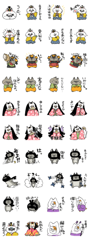 武士言葉・殿様言葉などを使った猫スタンプです。竹ノコ より発売