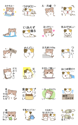 お疲れ気味 やる気が出ない時に使えるゆるかわ三毛猫とキジトラ白猫のアニメーションスタンプ第1弾 仕事 締め切り 進捗 社畜 家事 気づかい 春夏秋冬
