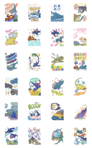 季節を彩る様々なサメ達のLINEスタンプです。 ホホジロザメやジンベエザメを始め、トラフザメやシロワニやイヌザメやネコザメ、果てはモミジザメなど。 ※このスタンプはトークルームで大きく表示されるBIGスタンプです。なすまに より発売
