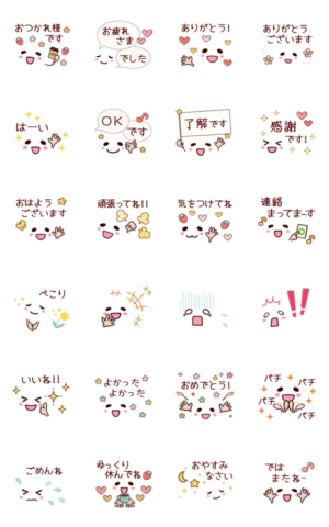 基本的に優しい言葉。日常生活に反射で返信できるような無難に使いやすい定番セットのスタンプです。かわいすぎないから家族や仕事や友達に年齢関係なく送りやすい顔文字