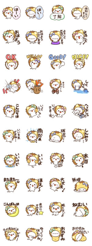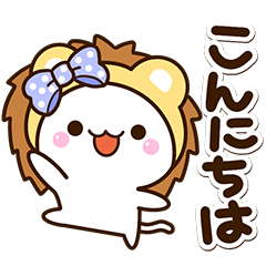 リボンをつけた小さい白猫『ちびシロ』がライオンのかぶりものを着けました。らいおんのような、かわいいネコスタンプ。しろねこ好きな方にぜひ。【かたこ】かたこ より発売