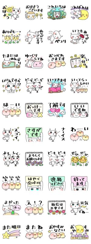 文字が大きくて見やすいシンプルな40個。やさしい気持ちが伝わる、うさきゅん、モモピヨ、パンダさんのほっこり*贈るスタンプです。母の日、休日などにも便利です。