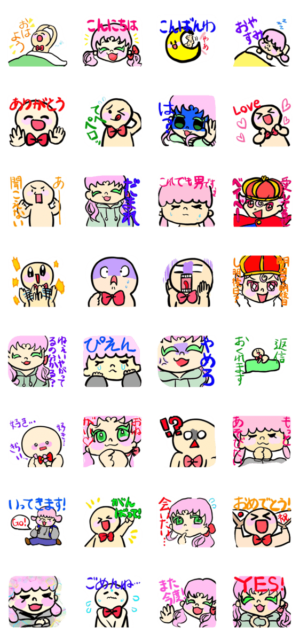 私のマイキャラのスタンプです!目をつぶっている子はメイリー、ツインテールがメイリーちゃん、王子様が王子、赤蝶ネクタイの子が元気くんです!是非使ってください!