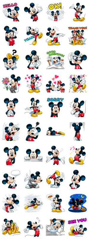 みんなが大好きなミッキーマウスのスタンプ。つぶらな瞳や可愛い仕草で、どんな表情もチャーミング♪表情豊かなミッキーのスタンプで毎日の会話をもっと楽しく演出!