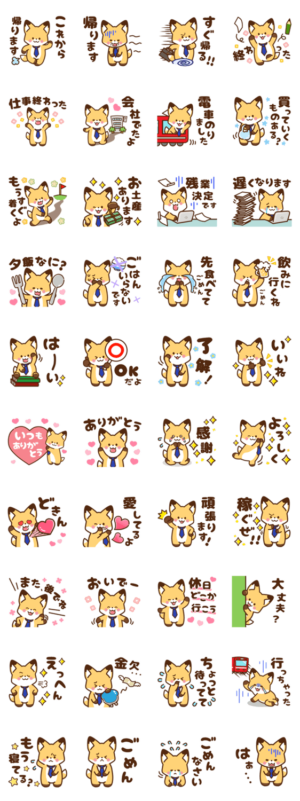 サラリーマンや働く男性、父親、彼氏が、愛する妻や彼女に送る日常用スタンプ。毎日使えて可愛いキツネのデザインなので、仕事や、連絡に使えます。父の日/仕事/家庭/恋人Haruna より発売