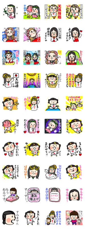 日本の神様をイメージした八百万の神スタンプ。コノハナサクヤ姫,イワナガ姫,ニニギノミコト,豊玉姫,玉依姫が新たにご登場。神社,神道,スピリチュアル,日本神話好きさんへ