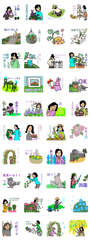 ガーデニング好きな女性の日常使えるスタンプです。いつも草木や花に囲まれています。庭にいるうさぎや鳩などの鳥も描きました。園芸、畑、農園、薔薇、ラベンダーなど。