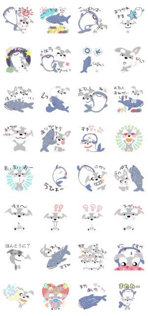 シュナウザー犬とジンベイザメの可愛いスタンプです (このスタンプは動きません)olive より発売
