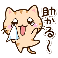 子猫のトラ猫が涙を浮かべて助かる~と言っているとてもかわいいスタンプです。