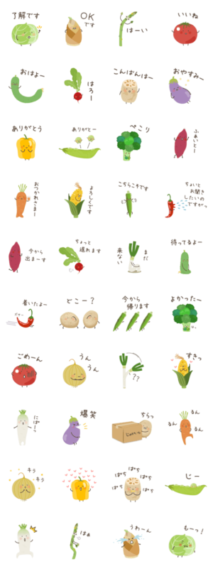 ゆるいやさいたちの日常で使えるスタンプです。つぶらな瞳であなたをとりこにします♪mamako より発売