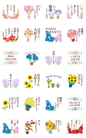 母の日、父の日、感謝を伝えたい時に使える、優しい花のイラストです。明朝体文字できちんとしたご挨拶。びおら より発売