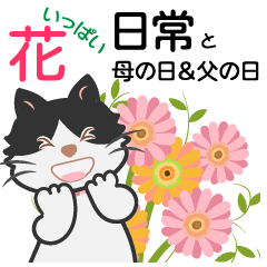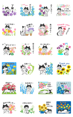 日常会話の花と猫のスタンプです。母の日、父の日スタンプもついています。春の花、ネモフィラ、チューリップ、バラ、アジサイなど、季節の花を添えて。びおら より発売