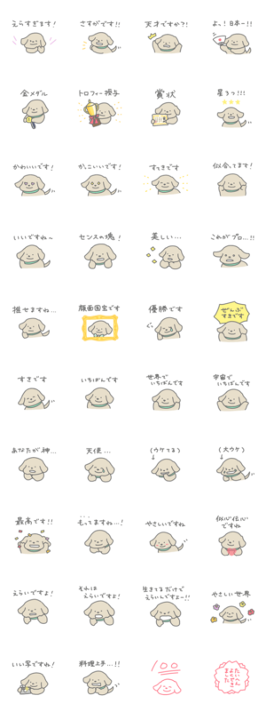 ほめるいぬのスタンプです。いろいろな褒め言葉でほめてくれます。敬語なので汎用性ばつぐんです。※誤字を訂正した修正版も販売しています→ほめるいぬ(修正版)sena より発売