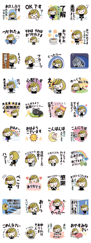 ボブヘアーのかわいい女の子の優しいスタンプです。 日常のあいさつに加えて、憂鬱な気分を吹き飛ばす励まし言葉がたくさん入っています。マキたん より発売