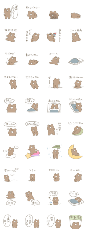 可愛いクマのマロンの無気力スタンプです。だるい休み明けにどうぞ。くま/ゆるい/日常会話/五月病猫原のし より発売
