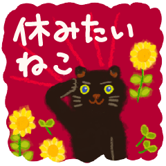 好きな言葉は「有給休暇」お休みする気満々な猫、花と緑もいっぱいのスタンプです。お絵描きすずめ より発売