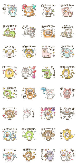 ねこぴが色んな動物に変身しています。ぞうさん/レッサーパンダ/カメレオン/ひつじ/アルパカ/パンダ/コアラ/たぬき/ひよこ/いのしし/うさぎ/ねこ/ペンギンかなぴ より発売