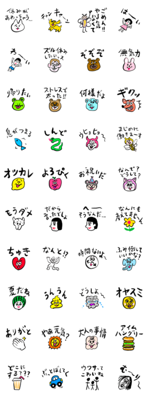 やる気がなく、かつ、ぶさいくキャラ多めのスタンプです。イッレ・コスヤ より発売