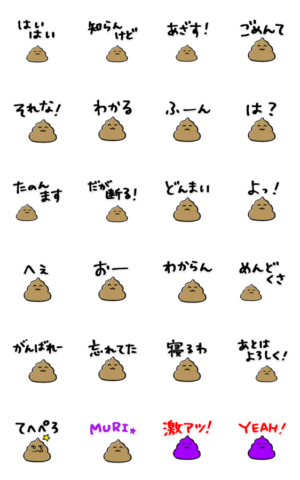 よく動くうんちのスタンプ。無責任・テキトーなセリフ多め。絵文字や着せかえも好評販売中! うんこ/かわいい/シュール/面白い/ネタ
