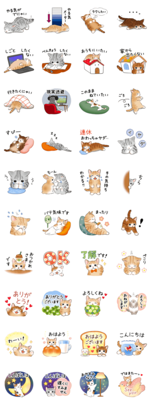 どうしてもやる気が出ない時にそっと使える優しいねこちゃんたちです。しごとしたくない…をやんわり使いましょう⭐︎もちろん、基本的な挨拶もあります!