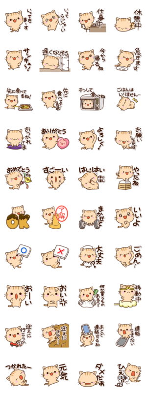 家族間の連絡に使えるメッセージが多いスタンプ。異なる世代間でも使いやすい猫という無難な題材が選ばれているのが偉い。クオリティも高く、ケチをつけるところが見当たらない。