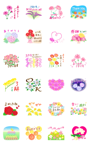 よく使う丁寧な言葉や挨拶など毎日使えるお花のスタンプです。スイートピー・カーネーション・ポピーなど色とりどりの花とともに、感謝や祝福の気持ちを♪