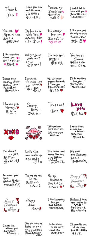 英語と日本語がついた恋愛トークスタンプ。 恋愛、バレンタインデー、クリスマス、好きを伝えたい。ラブラブ、熱愛、カップル、恋、愛。英会話、英語勉強、英語ペラペラ