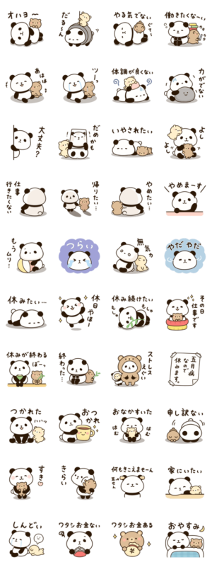 無気力なパンダと寄り添うクマさんのやる気が出ない時に使えるスタンプです。よつば より発売