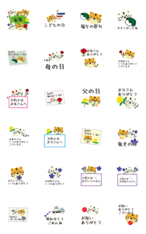 こどもの日、母の日、父の日、敬老の日にまめとら動く家族アニメーションスタンプ。2022年(令和4年)の干支は寅年(トラ年)まめとらシリーズ