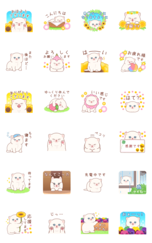 可愛いお花と白いブリティッシュショートヘアーの子猫が飛び出すスタンプです♪敬語で毎日誰にでも使えます。DECOR より発売