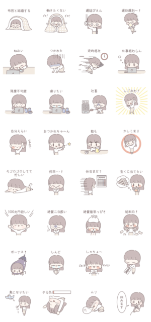 働く女性向けのゆるめのスタンプです。関連用語:女の子/あいさつ/サラリーウーマン/かわいい/仕事/五月病/やる気ない/働きたくない/カップル/友達/会社員/無気力