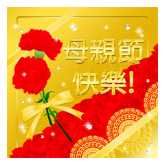 中国語(繁体字)台湾版。母の日。金色、キラキラ、華やかなメッセージ。 色とりどりのカーネーション。