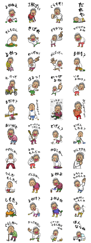 鹿児島弁おばあさんの大きなスタンプ【BIG】バージョンです。大きな文字で読みやすく、大きいイラストで見やすいスタンプになってます ※このスタンプはトークルームで大きく表示されるBIGスタンプです。Brody Machine より発売
