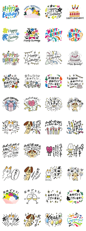 お誕生日をお祝いできるお洒落なスタンプ!かわいいものや大人っぽいものをセットに。ケーキ、クラッカー、花束、プレゼントや、おめでとうのメッセージも。犬や猫もあり!小林あきこ より発売