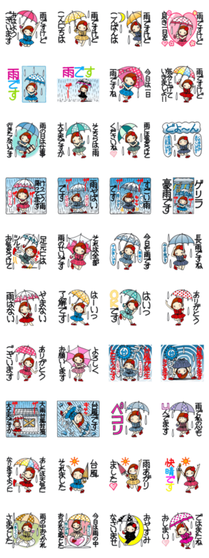 いつも暇をもてあましてるひま子ちゃんの今回は、雨の日に気楽に使える大人女子の雨・大雨・台風スタンプです。よろしくお願いします!