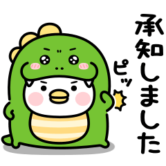 ちびトリの恐竜の着ぐるみを着たスタンプです。日常で使える敬語が多め。