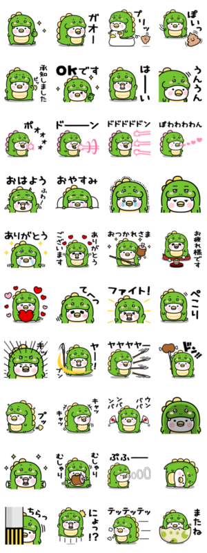 ちびトリと恐竜の合わせ技です。結構多彩なスタンプ!可愛くて使える。