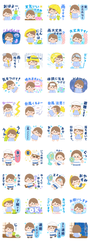 ボブヘアーのかわいい女の子♡梅雨の季節や夏にたくさん使えるスタンプです♪雨の日/お天気/災害/涼しげな色/夏/くっきり文字/ふなみん より発売