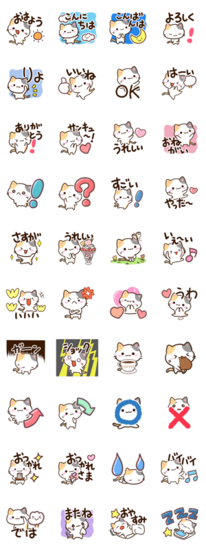 『小さい三毛猫』の『着せかえ』と『絵文字』もあります!毎日便利に使える言葉とシンプルで分かりやすい飾りのミケネコスタンプです。みけねこ好きな方にぜひ。【かたこ】かたこ より発売
