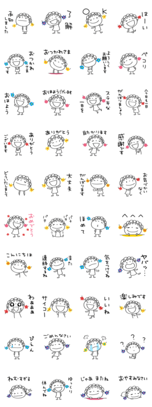 「OK」「いいね」から「感謝です」まで。花の髪飾りをしたキュートなくるリボンがいっぱい。華やか気分で日常メッセージを届けよう。家族、学校、お仕事でも。