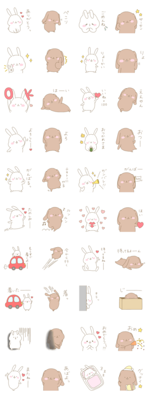 おもちみたいなほっぺのうさぎちゃん。明るく元気な『みるく』と、自由奔放な『ここあ』です。よく使う基本的なスタンプをまとめました♪