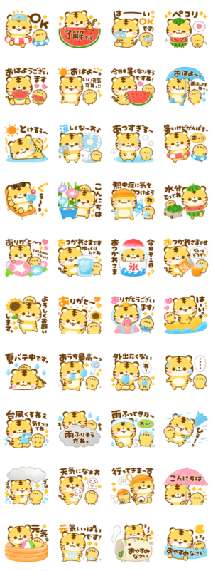 夏にかわいい♪虎さんのスタンプです。お天気〜日常の挨拶・気遣いまで色々入ってます♡とらトラぴよたぬき♡ より発売