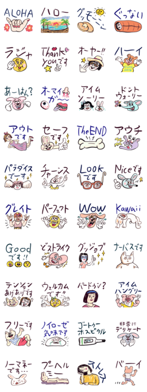 中学英語、和製英語、エセ英語、なんとなく横文字のシュールなスタンプです。デカ文字、謎動物キャラ、レトロイッレ・コスヤ より発売