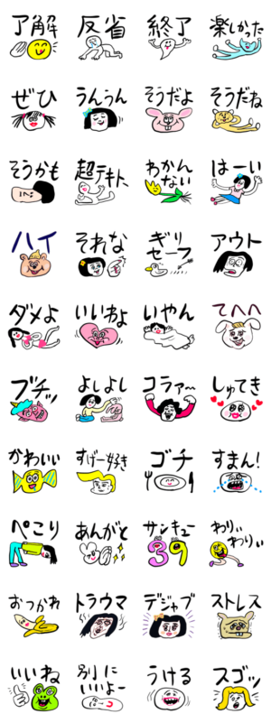 イヤでも目に入ってくるデカ文字スタンプ。老眼の方、眼精疲労の方、気持ちをちゃんと伝えたい方、シュールでゆるい絵が好きな方に。毎日使える言葉がしっかり入ってますよ
