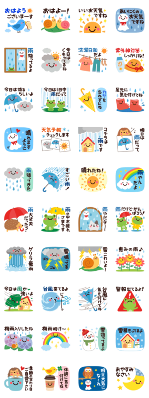 ちょっとだけ大人の、子供すぎない天気スタンプ。晴れ・雨・梅雨・雷・台風・雪など、便利に使えるスタンプです♪みーすけ より発売